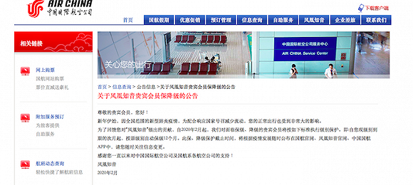 2月4日,国航曾在其官网上发布了《关于凤凰知音贵宾会员保降级的公告》,表明自2020年2月起,对面临保级、降级的贵宾会员,将自现级别到期的次月起按原级别自动保级12个月。这一活动不需要注册,系统会自动变更会籍有效期。