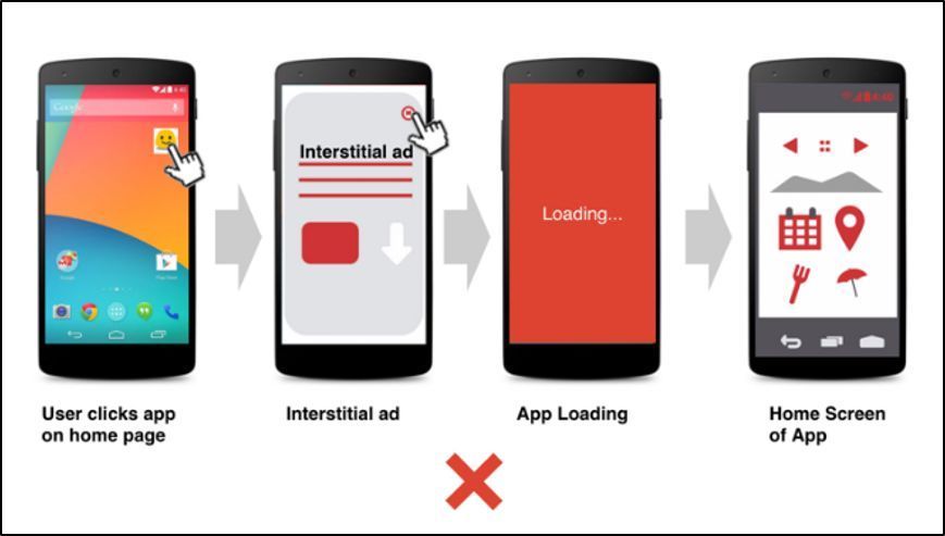 插页式广告只能展示在投放此类广告的应用内。如果App会展示插页式广告或其他干扰正常使用行为的广告,谷歌要求开发者必须让用户能够轻松将其关闭,且不会因此蒙受任何损失。