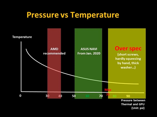 华硕称,在设计之初,AMD提供的工程资料建议散热器下压固定压力在30~40 psi,早期量产批次的确参考执行。但后续进一步的测试检查发现,更合理的压力值应该在50~70psi之间。