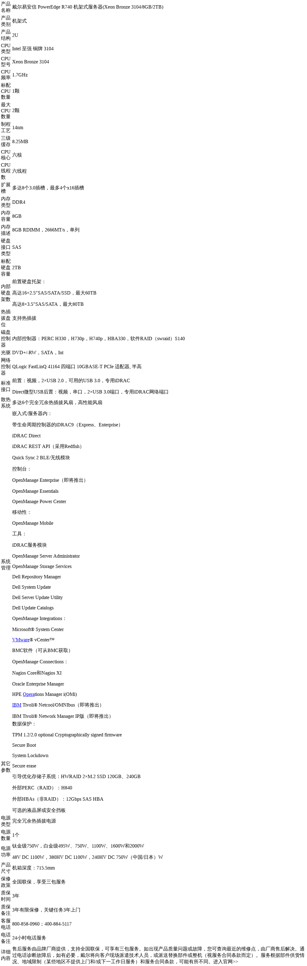 [品牌型号] 戴尔易安信 PowerEdge R740 机架式服务器(Xeon Bronze 3204*2/8GB*2/2TB)