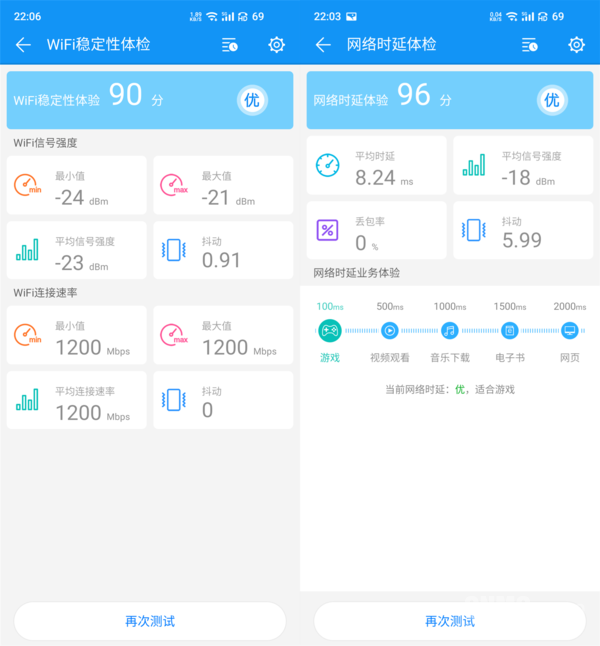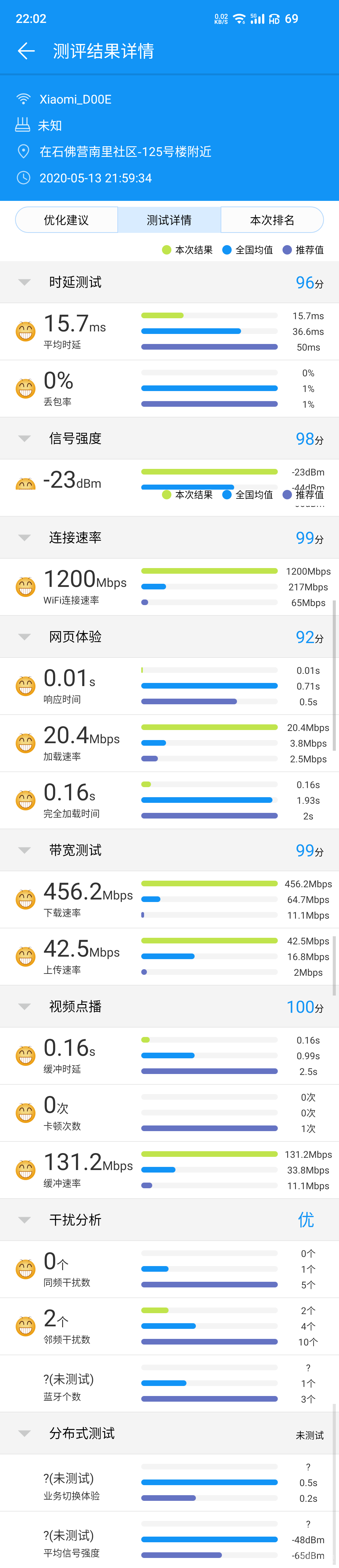 宅小秘使用WiFi评测大师对小米路由器AX1800进行测试,看在最好的状态下,小米路由器AX1800能为用户提供怎样的表现。连接至5G WiFi网络后,在距离路由器一米的位置进行全面测试,从图中可以看到,小米路由器AX1800的平均时延为15.7ms,丢包率为0%;信号强度为-23dBm,连接速率为1200Mbps;网页响应速度为0.01s,加载速度为20.4Mbps,完全加载时间为0.16s;宽带下载速率为456.2Mbps,上传速度为42.5Mbps;视频点播的缓冲时间为0.16s,卡顿次数为0,缓冲速率为131.2Mbps,可以说经过实际测试,小米路由器AX1800的实际表现与其宣传的相符。当宽带连接到设备后,它充分利用每一兆带宽。