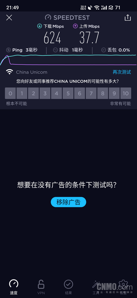 在实际测试中,宅小秘使用一款搭载高通骁龙865移动平台的安卓旗舰机进行网络测试。如今宅小秘将家中的宽带升级至500兆,因此能更好地展现出WiFi6在速度上的优势。根据Speedtest测试结果显示,在小米路由器AX1800提供的5G WiFi6网络环境下,下载速度达到624Mbpss,上传速度为37.7Mbps,能充分挖掘出带宽的极限。