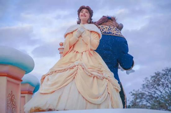 还有网友恰好捕捉到花车巡游中的贝儿与茶壶、蜡烛家臣们出现在正在建造的野兽之城前,一下把人拉进了《美女与野兽》的故事情节,太入戏了!这美好的景致完全让人等不及了啊!
