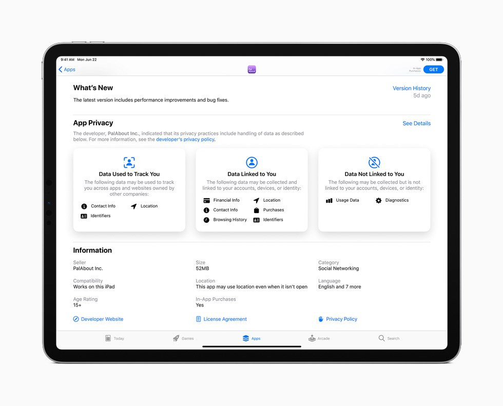 App Store 中新增的关于隐私处理的信息,可帮助用户在下载 app 之前了解其处理隐私的做法。