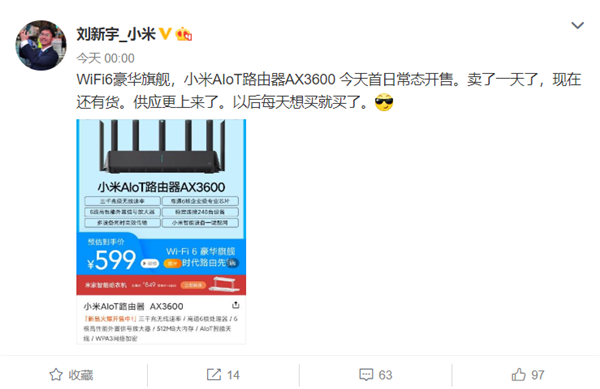 4月17日,小米路由器AX3660迎来现货发售,售价599元。小米智能硬件部总经理刘新宇表示:“小米AIoT路由器AX3600 今天首日常态开售。卖了一天了,现在还有货。供应更上来了。以后每天想买就买了。”