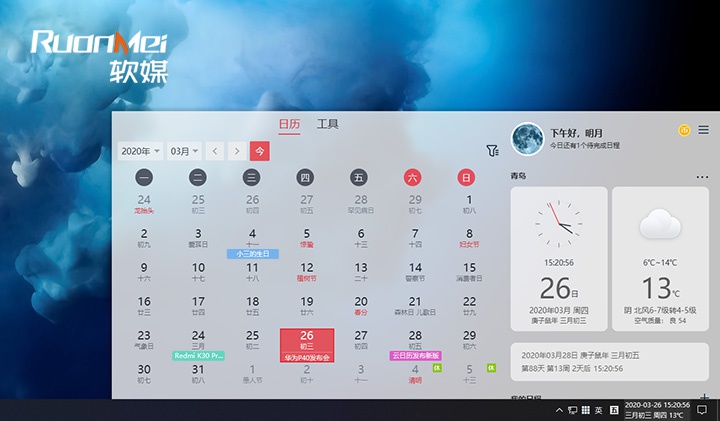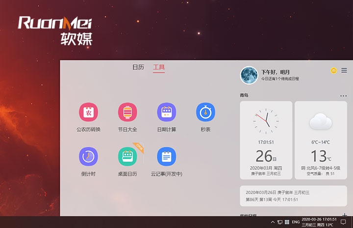 ▲ 上图:云日历运行后会自动替换任务栏右下角系统时间区,鼠标悬浮时就会弹出上面图片里面的基础窗口(目前只有 Windows 10 系统里是全局透明处理的)