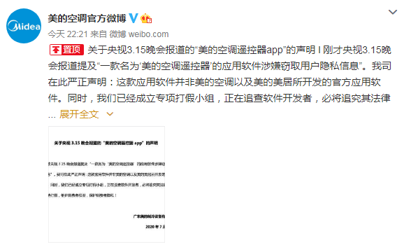7月16日晚,2020年央视3.15晚会期间,一则报道提及“一款名为‘美的空调遥控器’的应用软件涉嫌窃取用户隐私信息”。对此,美的空调官方微博当晚立即回应:这款应用软件并非美的空调以及美的美居所开发的官方应用软件。