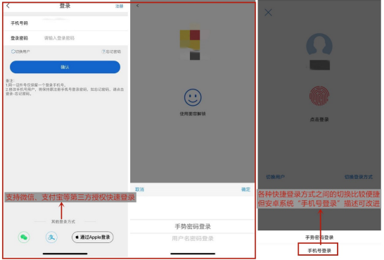 在日常登录中,浦大喜奔APP支持手机号登录,也支持支付宝、微信和Apple ID第三方授权登录。APP基于机型支持刷脸、指纹和手势等快捷登录方式,且切换便捷。如果用户忘记密码,可在登录界面选择“忘记密码”,通过验证注册手机号和身份证信息后重设密码。