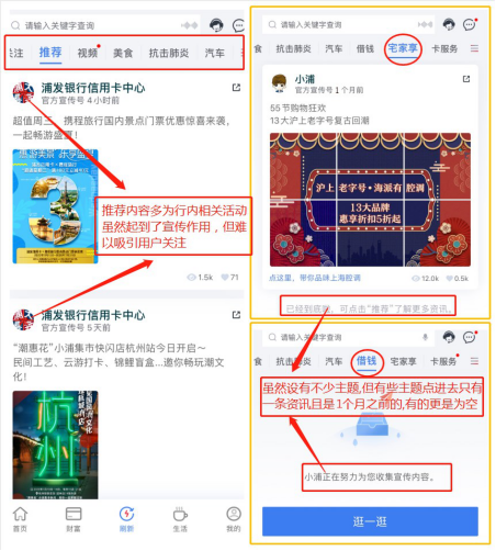 除了财富、生活频道之外,APP单独设置了“发现”频道,主要聚焦营销、服务等各类消息,有视频、图文等多种形式,用户也可以添加/取消关注。但可惜的是,目前主要是本行内部的一些营销信息,部分内容更新不及时,且多数信息流只能浏览不能进行相关操作,对用户吸引力不足。