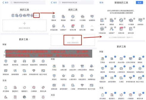 在界面布局上,浦大喜奔APP底边栏划分为“首页、财富、发现、生活、我的”五个频道,设置较为合理。具体来看,APP“首页”采用了“导航栏、头图区、常用功能区、借贷理财+多个专区楼层”的架构。其中,导航栏设置了“扫一扫、搜索、付款码和客服”4个常用功能入口,但没有“消息”入口。头图下方常用功能区采用了“9+1”的十宫格模式,用户点击“更多”可以查看/搜索所有工具,也可以根据个人习惯自定义快捷功能键。值得注意的是,快捷功能键自定义逻辑比较合理,但略有不完美之处——用户若只想调整顺序,“+”的提示不够清晰。此外,首页虽然推荐内容丰富,但8个专区楼层样式不一、用户下拉超过5屏,有些过长。