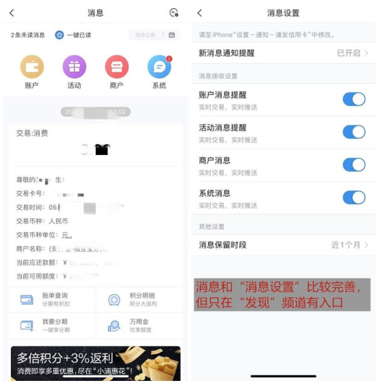 消息提醒方面,浦大喜奔APP“消息”整合了动账通知、活动消息、商户优惠和系统提示。用户每一笔消费/还款等交易,APP会推送通知,且每个通知都关联了必要操作。特别值得一提的是,用户可以设置消息接收类型和保留时长,也可以一键已读,还可以按日期筛选。