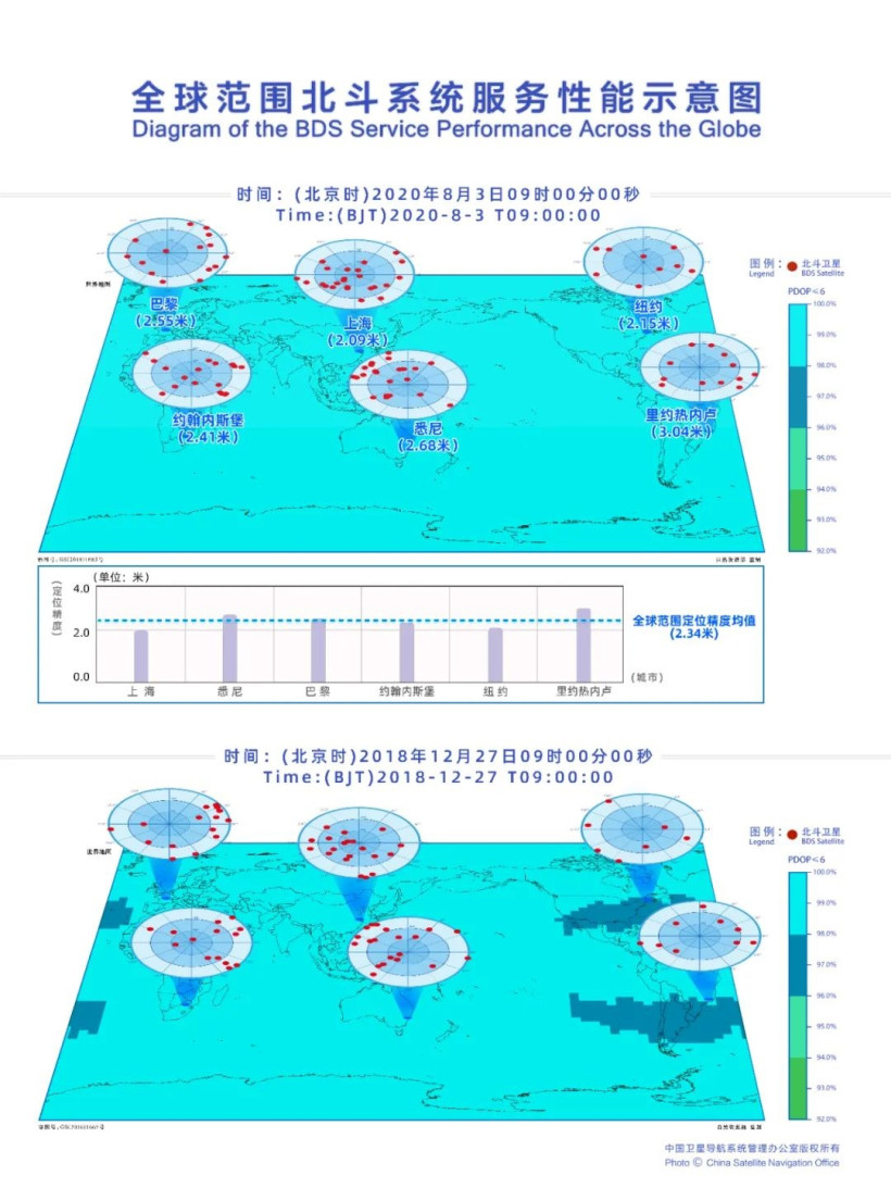 二是性能指标先进。全球范围定位精度优于 10 米、测速精度优于 0.2 米 / 秒、授时精度优于 20 纳秒、服务可用性优于 99%,亚太地区性能更优。这里,我向大家展示一张图片,借此说明三点:一是北斗系统全球服务可用性,下面这张图是 2018 年刚建成北斗基本系统时的情况,图中阴影部分是系统不能覆盖的区域,当时全球服务可用性为 95%; 如今北斗全球系统建成后,在上面 2020 年的图中,已没有阴影,全球服务可用性 99% 以上。二是全球典型区域上空北斗卫星的星空图,红色圆点代表观测到的北斗卫星,可以看出相较两年前,现在各区域上空可视卫星数明显增多。三是北斗系统定位精度,根据全球连续监测评估系统最近一周测算结果,北斗系统全球实测定位精度均值为 2.34 米。
