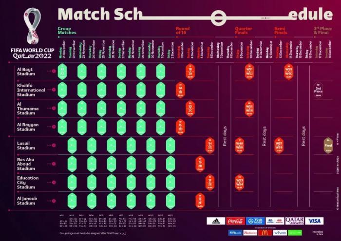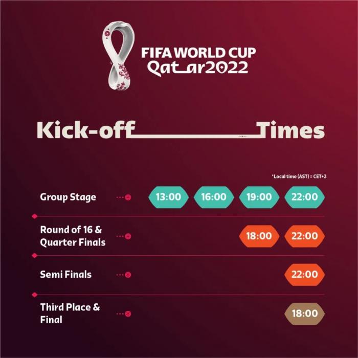 2022年3月国际比赛日后,所有球队出炉后将举行抽签仪式确定最终对阵赛程。抽签结束后,组委会将对各场次开球时间进一步讨论调整的可能性,以提供一个对于各个国家主队球迷在家观赛和卡塔尔现场观赛的球迷都有利的比赛时间。