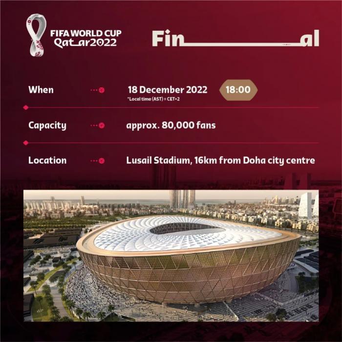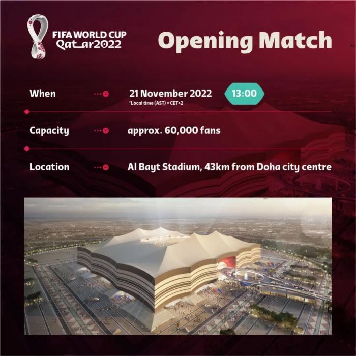 海湾体育场将于当地时间2022年11月21日13时举办卡塔尔世界杯揭幕战。这座球场拥有60,000个座位,球场命名和建筑形状灵感来源于海湾当地游牧民族所使用的帐篷。小组赛阶段所有的比赛都将于当地时间13时、16时、19时和22时四个时间点开球。淘汰赛阶段比赛将于当地时间18时和22时进行。哈里发国际体育场将在12月17日举办三四名决赛场地。而决赛将于当地时间次日18时在能容纳80,000人的卢塞尔体育场进行。