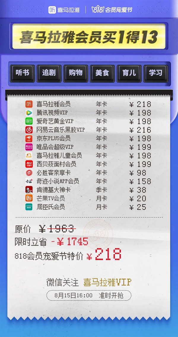 该活动8月15日16:00正式开抢,13种会员总价值1963元,限时立省1745元。