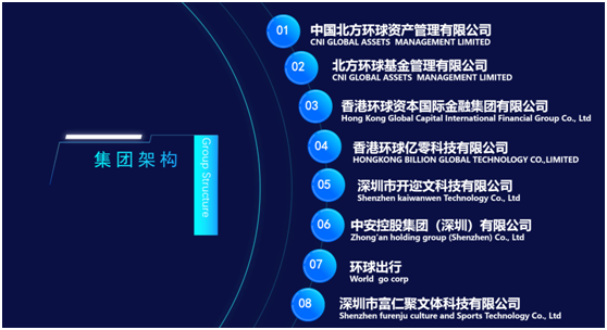 资料显示,这家名为香港环球控股发展集团的公司,总部位于香港,纽约、伦敦、迪拜、墨尔本都设有办事处,业务范围涵盖金融、互联网、大健康、高科技、传媒,旗下拥有包括中国北方环球资产管理有限公司在内的8家子公司,并获发了香港证监会的1号和9号金融牌照。