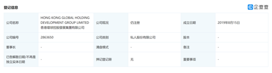 记者通过企查查数据查询发现,香港环球控股发展集团成立于2019年8月15日,存续时间尚不足一年,登记信息十分有限。