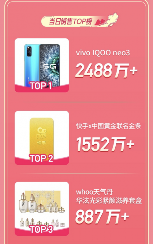 其中vivo IQOO neo3手机、快手&中国黄金联名款金条为快手电商官方百亿补贴商品。这两款商品也分别以2488万元+和1552万+的成交额位列本场直播销售榜的TOP1和TOP2。WHOO后天气丹礼盒则以887万+成交额位列TOP3。