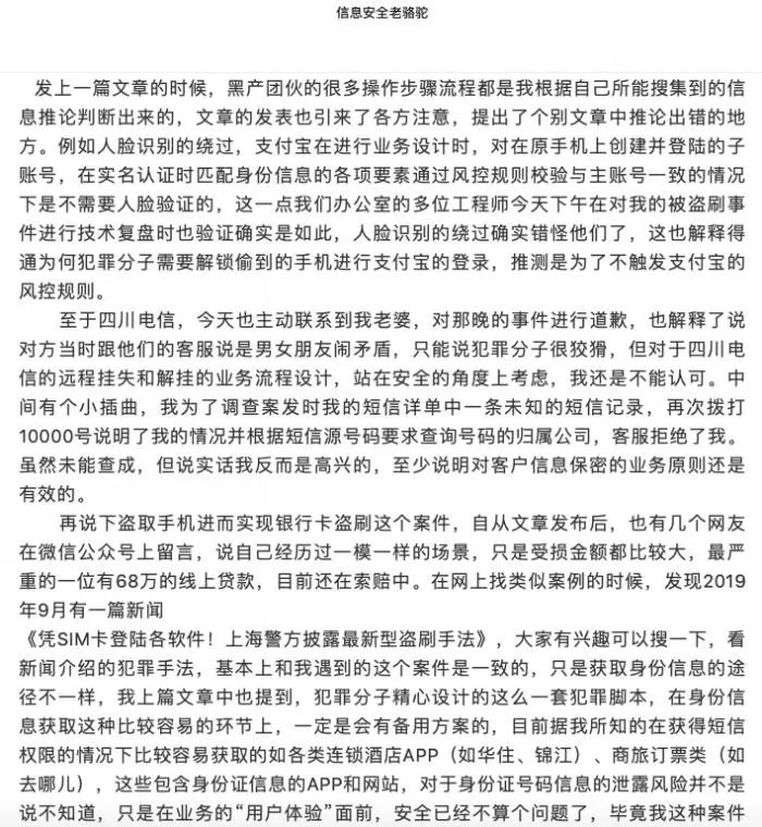 在网上找类似案例的时候,发现2019年9月有一篇新闻——《凭SIM卡登陆各软件!上海警方披露最新型盗刷手法》,大家有兴趣可以搜一下,看新闻介绍的犯罪手法,基本上和我遇到的这个案件是一致的,只是获取身份信息的途径不一样。