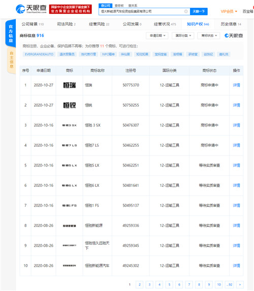 天眼查APP显示,10月16日,恒大新能源汽车投资控股集团有限公司申请了多个商标名称为“恒驰 3 SX”、“恒驰7 LS”、“恒驰5 LX”、“恒大恒驰汽车”、“恒驰恒久远驰天下”等商标,商标国际分类为运输工具,商标状态为商标申请中。此外,今年3月4日,该公司申请注册“恒驰”、“HENGCHI”商标,国际分类涉及运输工具、广告销售等。另外,2019年,该公司还申请注册了恒马、恒智、恒优、恒电、恒冠、恒坤等商标。