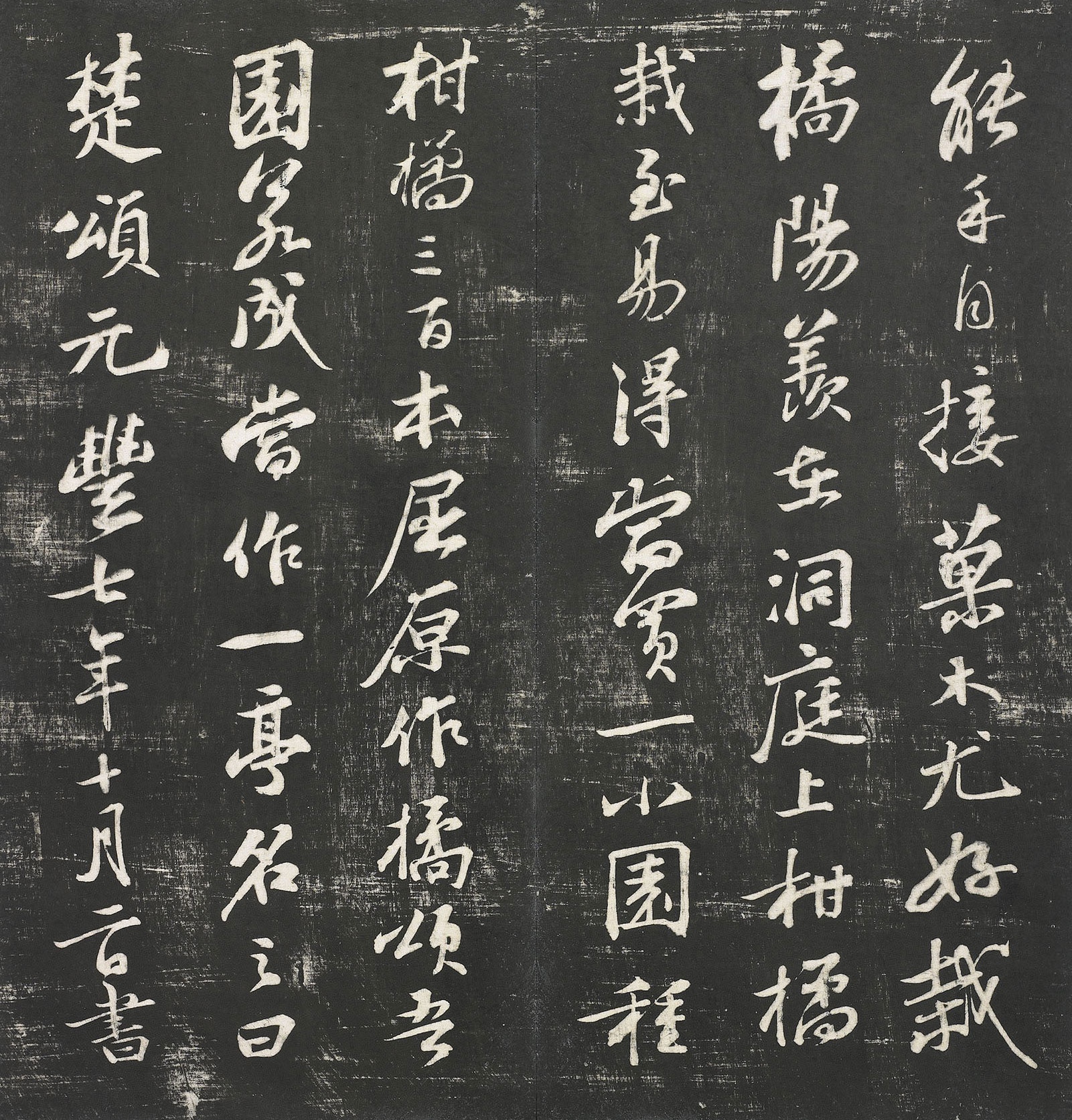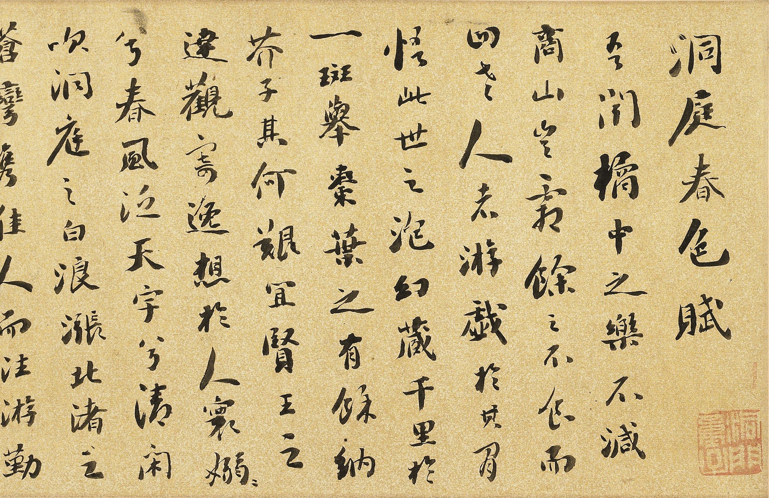 其《洞庭春色赋》由谭伯羽、谭季甫先生捐赠,依次书苏轼(1037-1101)《洞庭春色赋》、王羲之(303-361)《奉橘帖》、韦应物(737-792)诗作等。按卷首“洞门童子”印,约书于85岁。通篇笔走中锋,线条丰厚而不迟滞,灵动而不轻佻,给人信手拈来、举重若轻、雄健、内敛之感,是脱胎自颜真卿(709-785)的佳作。