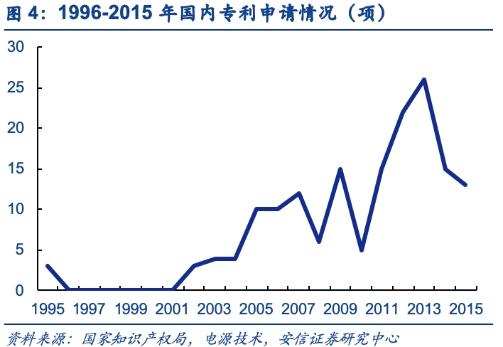 国内对固态锂电池的研究起步相对较晚。国内关于全固态锂电池专利申请数量相对较少,1996-2015年期间共申请专利170项。通过检索国家知识产权局检索数据,查询了1996-2015年期间公开的全固态锂电池专利申请数据,期间共申请专利170项。