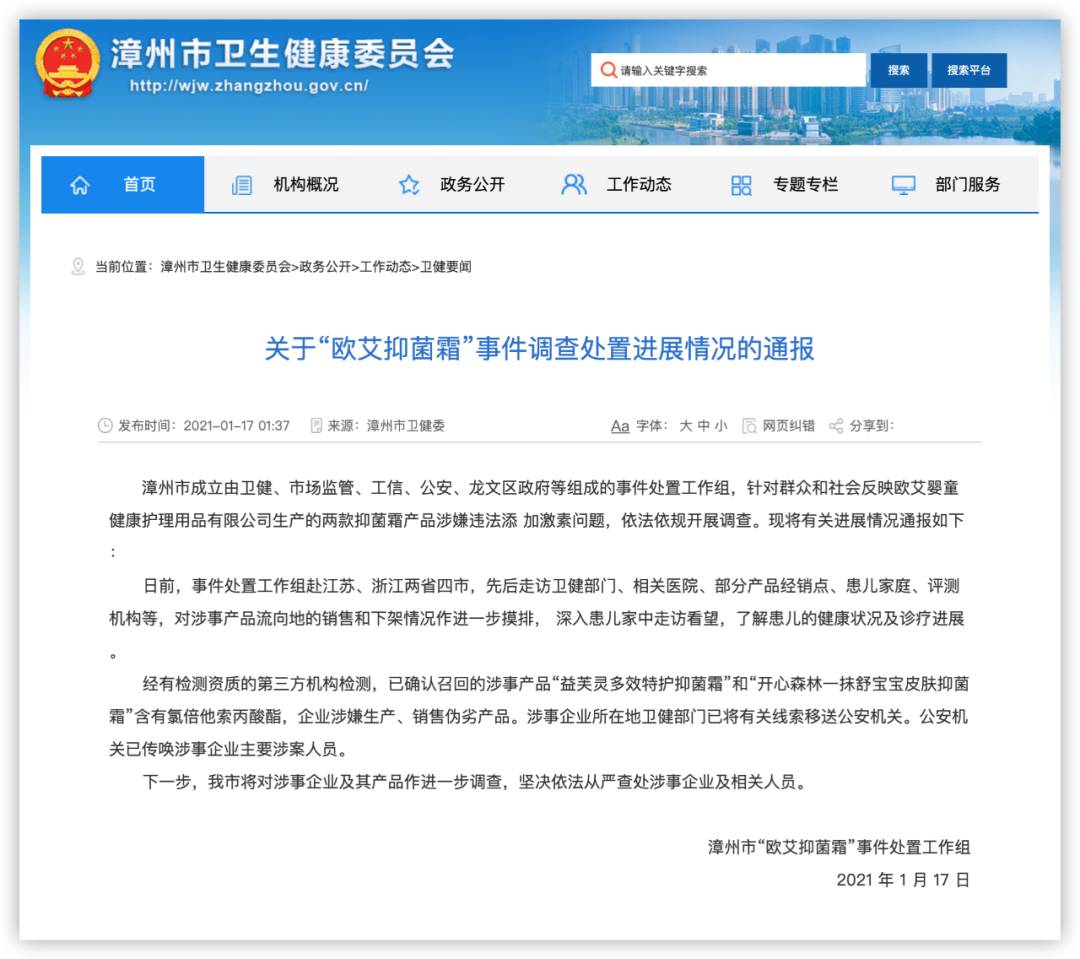 1月17日,福建省漳州市发布关于“欧艾抑菌霜”事件调查处置进展情况的通报称,漳州市成立由卫健、市场监管、工信、公安、龙文区政府等组成的事件处置工作组,针对群众和社会反映欧艾婴童健康护理用品有限公司生产的两款抑菌霜产品涉嫌违法添加激素问题,依法依规开展调查。