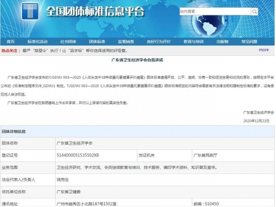 同时,在2020年12月22日,广东省卫生经济学会也在《全国团体标准信息平台》发布了自我承诺,《承诺》称,广东省卫生经济学会发布的T/GDWJ 003—2020《人体头发中38种微量元素健康评价阈值》团体标准遵循开放、公平、透明、协商一致和促进贸易和交流的原则,按照在本平台公布的《标准制定程序文件_GDWJ》制定。T/GDWJ 003—2020《人体头发中38种微量元素健康评价阈值》团体标准规定的内容符合国家有关法律法规和强制性标准的要求,没有侵犯他人合法权益。并表明广东省卫生经济学会在自愿基础上作出本承诺,并对以上承诺内容的真实性负责。