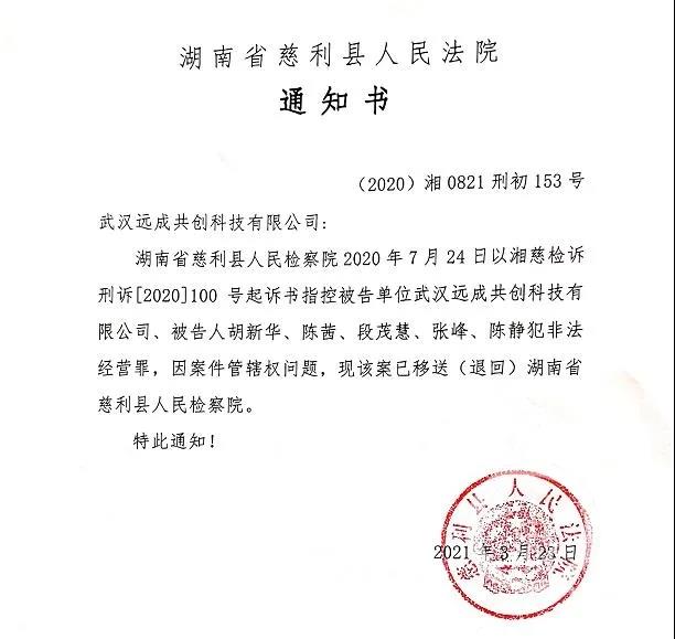 同日,上游新闻记者从涉案企业武汉远成共创科技有限公司(下称远成科技)大股东叶思处了解到,3月23日,慈利县法院向远成科技发《通知书》称,慈利县法院因管辖权问题,将慈利县检察院指控武汉远成科技有限公司及胡新华等犯非法经营罪一案退回至慈利县检察院。3月24日上午,叶思代表远成科技来到慈利县法院签收了这一通知。