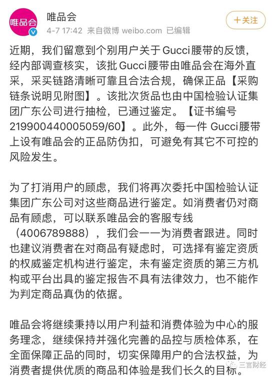 唯品会附上了一系列中检集团广东公司出具的鉴定报告和产品采购链条相关证明。根据该报告,这批于3月7日送检的Gucci腰带抽检结果为“符合”。此外,唯品会方面还表示将再次委托中检集团鉴定,以打消消费者顾虑。