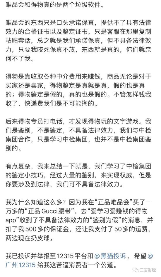 回到事件本身,经过三言财经分析可知,无论是唯品会还是得物,实际上双方既无法保证Gucci腰带是真货;同时也无法确保“鉴别结果”具有权威性。