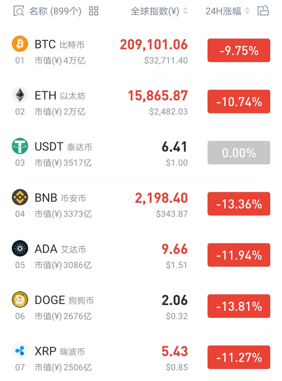 6月8日,数字货币再度重挫,过去24小时内,比特币暴跌近10%,以太坊、币安币、狗狗币、艾达币、瑞波币等跌幅均超10%。