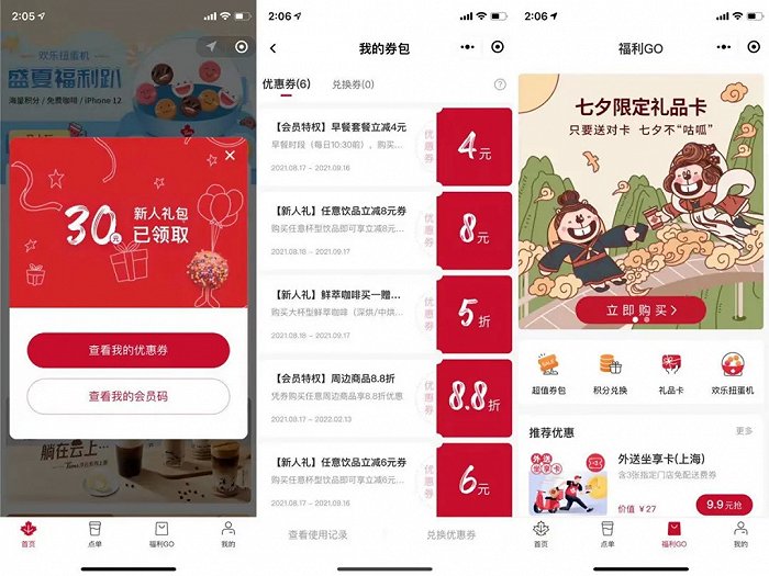 据新消费Daily了解,Tims中国尚未拿到资本加持,在进入中国市场之初时,就已经十分注重打造属于自己的用户流量池。2019年9月,Tims中国便上线饿了么,随后又与美团达成合作,加速线上渠道布局。