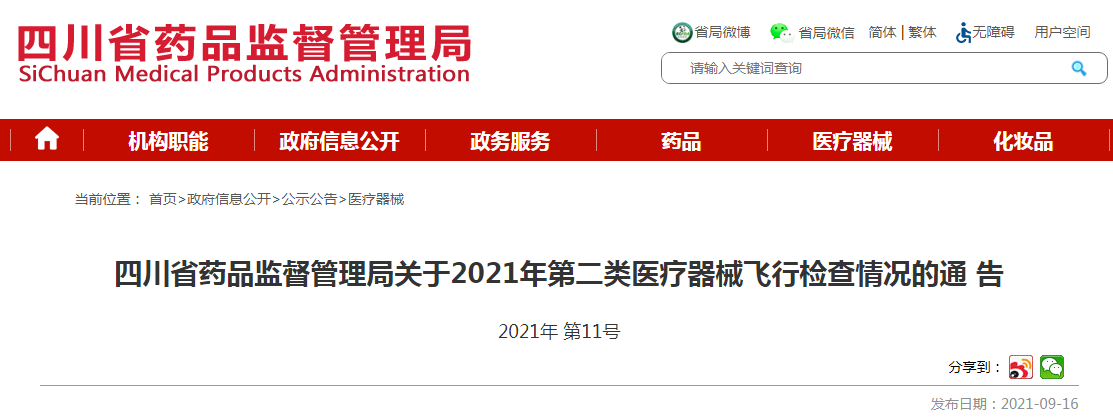 原标题:四川省药品监督管理局关于2021年第二类医疗器械飞行检查情况的通告(2021年 第11号)