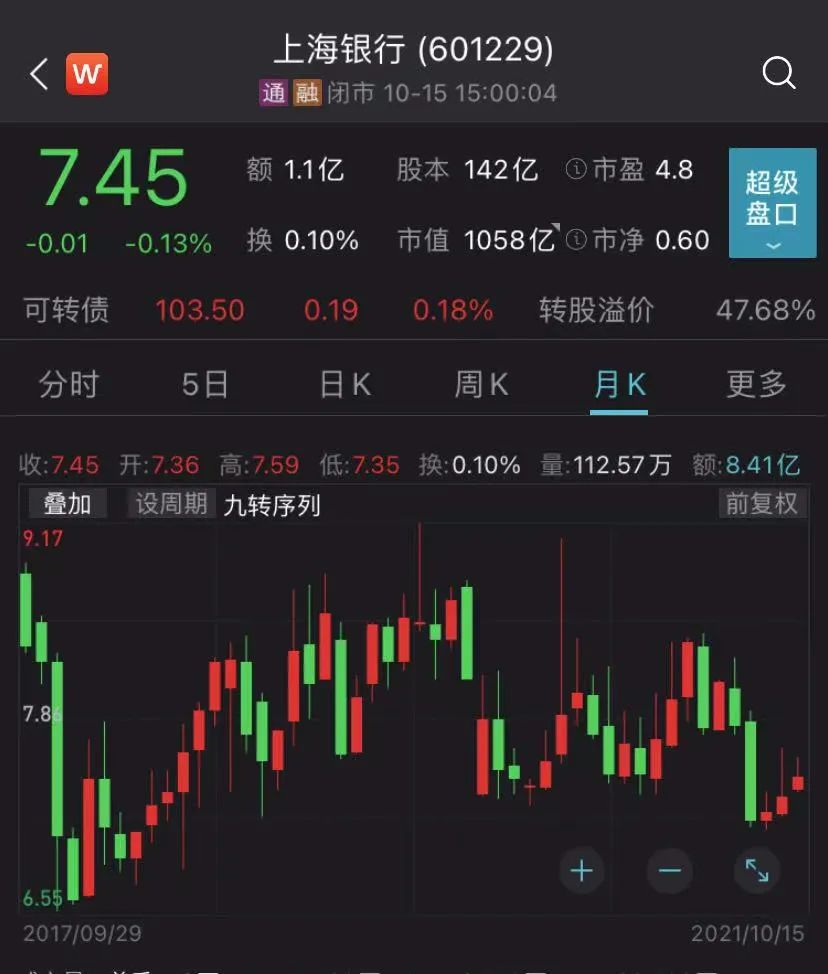 今年6月以来,上海银行股价经历近两个月下跌后持续震荡,截至15日股价为7.45元/股,相比年内最高价下跌11.8%,最新市值为1058亿元。