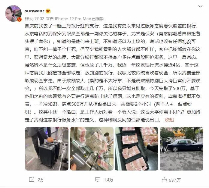 原标题:微博大V怒怼银行服务差,当场取走500万!光点钞就2小时,劳斯莱斯运走!涉事银行回应
