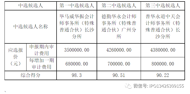 第三中选候选人:普华永道中天会计师事务所(特殊普通合伙)长沙分所,应选报价,申报期内审计费用438万元,每增加一期审计费用80万元,综合得分90.22