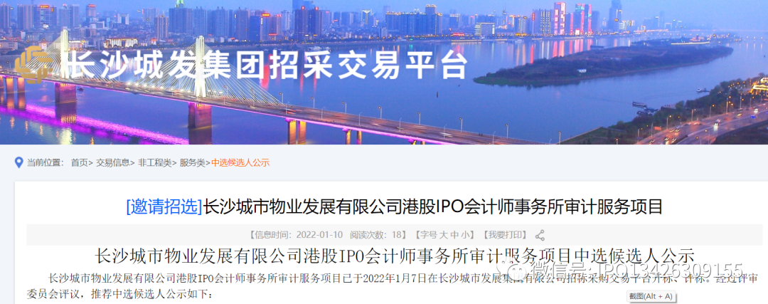 长沙城市物业发展有限公司港股IPO会计师事务所审计服务项目中选候选人公示