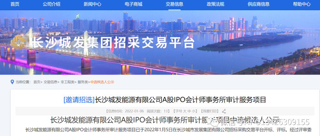 长沙城发能源有限公司A股IPO会计师事务所审计服务项目中选候选人公示