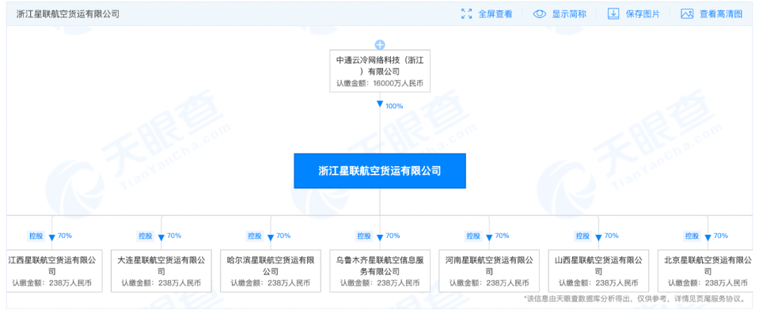 天眼查资料显示,星联航空成立于2018年3月,中通间接持股,为大股东。全国来看,中通已经在北京、深圳、河南等地布局了37家星联航空子公司。