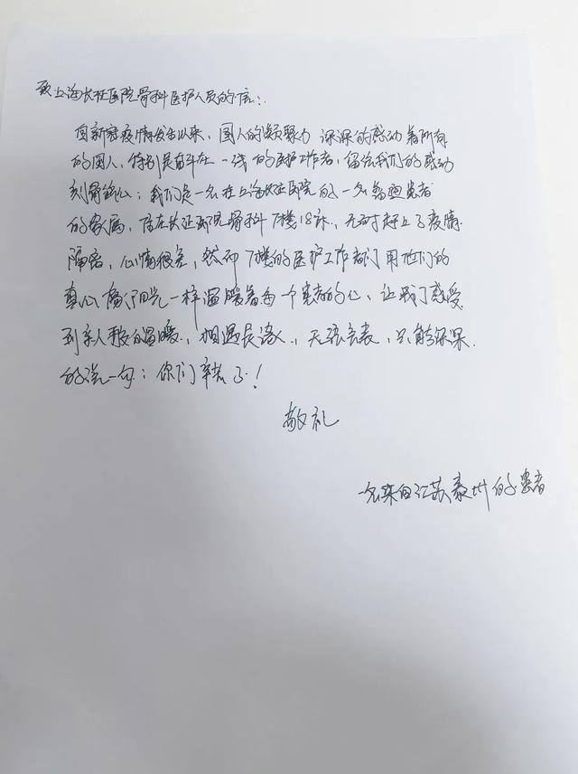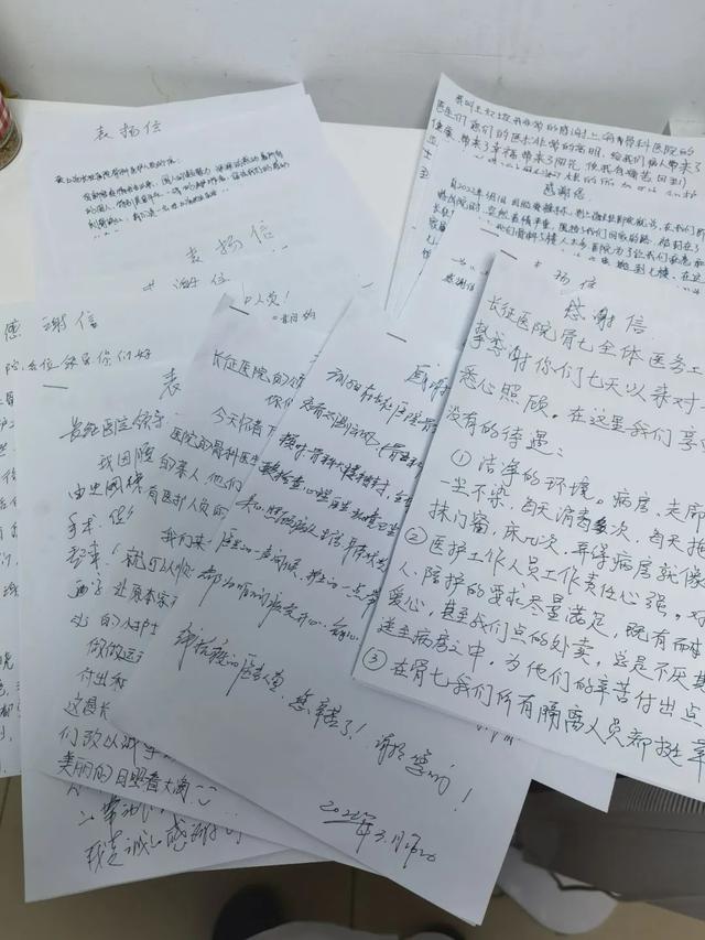 一封封来自患者和家属的感谢信是医护人员工作的最好体现。一位患者家属是这样说的:“我是上海长征医院的一名普通患者家属,住在长征医院骨科七楼18床,无奈赶上了疫情隔离,心情很差,然而七楼的医护工作者们用他们的真心像阳光一样温暖着每一名患者的心,让我们感受到亲人般的温暖,相遇是缘,无以言表,只能深深的说一句:你们辛苦了!”。