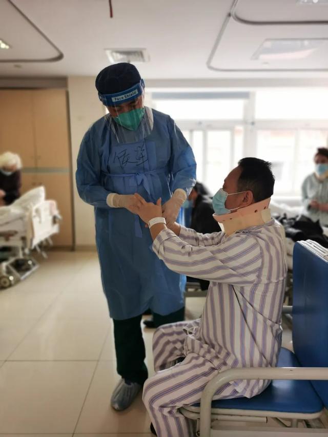 “全员一盘棋,互相理解、互相支援”。颈胸椎疾病病区陈雄生主任带着自己的团队分流病人让出病区。颈腰椎疾病病区史建刚主任带领临时医疗护理团队留下,接收5楼分流的患者。