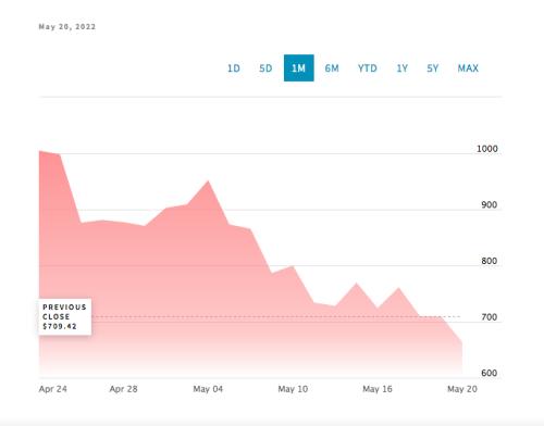 尤其在上周五即5月20日这天,收盘价低至633.9美元,25天内,股价下跌近33%。而2021年,特斯拉股价最高曾达1243美元。
