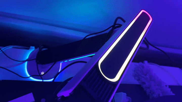 灯效方面色彩过度自然,亮度合适,看起来也不会廉价,集成到支架里也能提供不错的氛围感,懒得布光的小伙伴也不用单独买灯了,RGB的效果还不错。