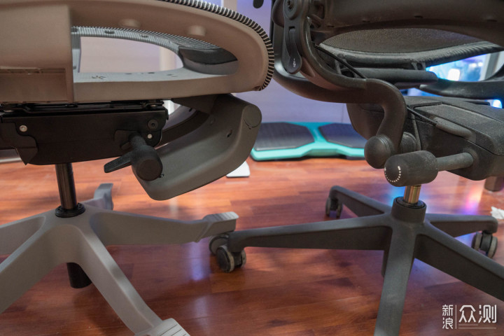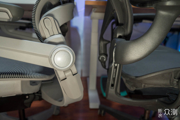两款椅子的手托调节,Aeron需要打开开关,抓住扶手升降,S9是片状开关,打开后可以直接升降,两款椅子手托都有宽窄的调节,适合不同体型人的需要。