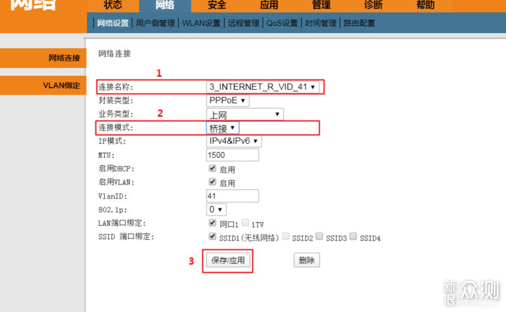 更改桥接模式]首先利用超级管理员账号和密码登录网关管理页面,网络-网络设置页面,连接名称修改改为3_INTERNET_R_VID_41,连接模式从路由修改为桥接,最后保存即可。初次安装前可以让安装师傅直接设置好,后期想自己改的话可以打电话给安装师傅要。