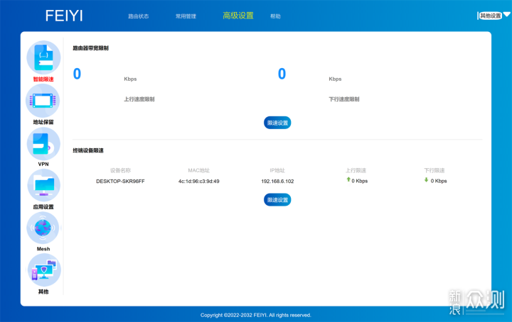 天邑AX3000双频千兆Wi-Fi6无线路由器网页后台,高级设置页面中,可以对路由器带宽进行限速,可以对独立设备进行限速,在地址保留、VPN、应用设置、Mesh、其他等页面中,可以按照自己使用需求进行细致的调整。