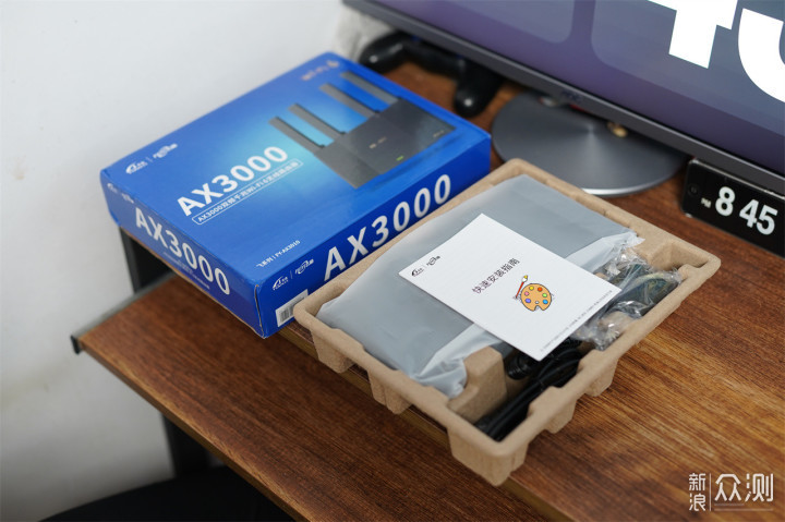 产品包装盒简单而朴实,蓝色系设计风格的盒子上,大家可以通过阅读图文信息就可以对这款产品有初步的了解,打开包装盒可以看到天邑AX3000双频千兆Wi-Fi6无线路由器主机、附送的配件、快速安装指南放置在纸质托衬内。