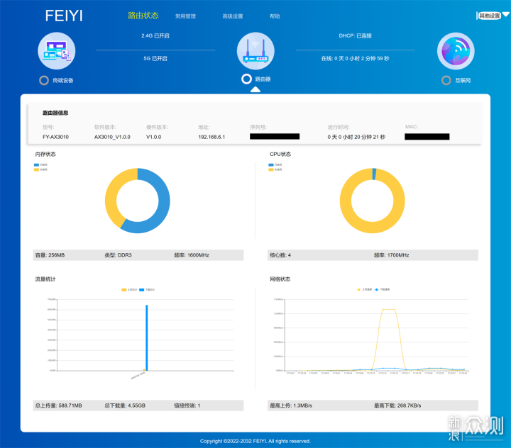 天邑AX3000双频千兆Wi-Fi6无线路由器的网页后台管理页面,可以看到这款产品当前的联网状态,以及路由器的详细信息,总的来说以图形方式进行展示,简单直接、清晰明了,并没有多余的设计,个人很喜欢这样的展示页面。