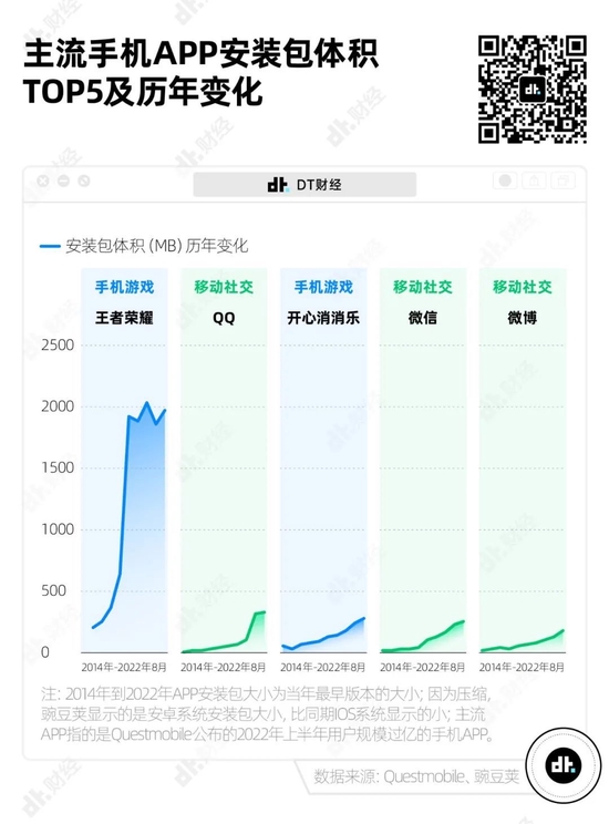 游戏APP的安装包通常初始状态就不小,更新迭代也不慢。以手游代表王者荣耀为例,2015年上线时它的安装包是207.02MB,因为不断上线新英雄、新皮肤,增添新的玩法、模式,加上优化游戏体验等,7年后的现在,王者荣耀光是安装包就有2个G。